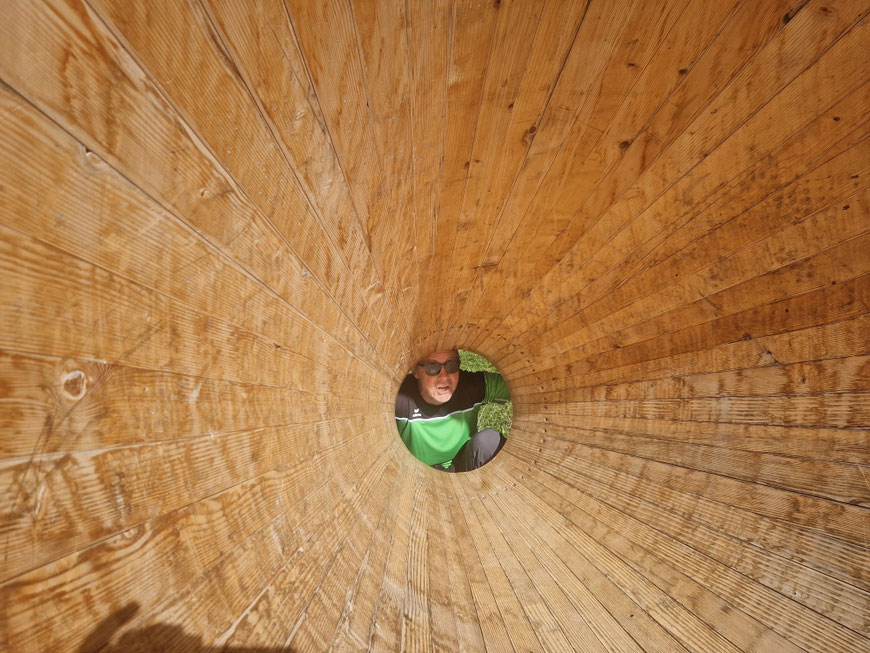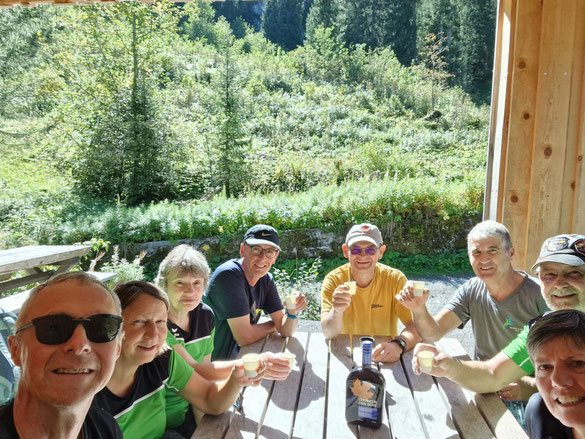 Nach der kleinen Stärkung ging es zu Fuss auf dem Klangweg Richtung Wildhaus weiter. Die verschiedenartigen Kunstobjekte auf dem Klangweg erstaunten uns immer wieder aufs Neue. Natürlich wurden diese bestaunt und auch sofort ausprobiert, sei es ein überdimensionierter Betruftrichter, verschieden angeordnete Kuhglöcklein, Trommeln, Baumspechte, etc. Auf einem Rastplatz überraschte uns Köbi mit einem Apéro. Extra aus Kanada mitgebracht, probierten wir seinen Ahornlikör mit Blaubeeren. Es blieb nicht beim Probieren…. Danke Köbi, einfach köstlich! Weiter ging es zur Bergstation Oberdorf. Auf der Sonnenterrasse stärkten wir uns mit einem feinen Mittagessen. Anschliessend ging es zu Fuss weiter Richtung Wildhaus und auf dem Thurweg zurück zum Parkplatz.